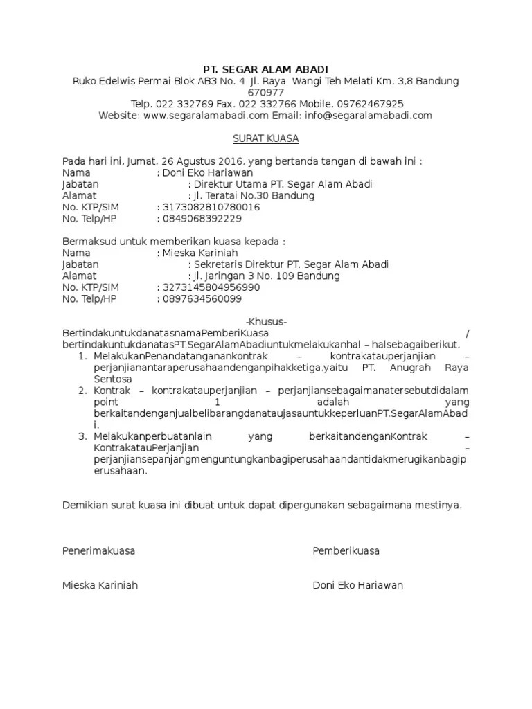 Contoh surat kuasa mewakili perusahaan untuk penandatanganan . Direksi dari dan selaku demikian untuk dan atas nama pt. Contoh surat kuasa direktur cv. Dengan demikian, surat kuasa direksi itu adalah medium penghubung antara pemberi kuasa, direksi, kepada penerima kuasa untuk dapat melakukan . Dengan ini memberikan kuasa kepada :